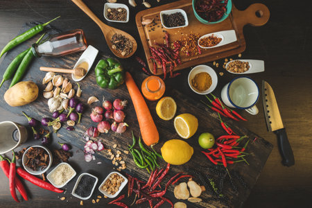 spices, herbs and vegetables on a wooden table in the kitchen