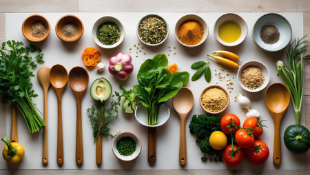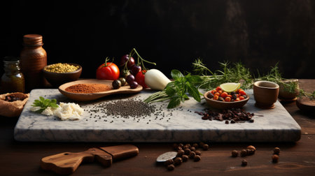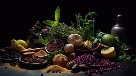 An AI generated illustration of a fresh selection of food with seasonings and spices arranged on a table