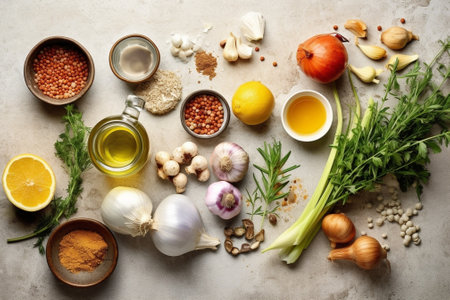 An inviting collection of vibrant herbs, aromatic spices, wholesome legumes, and fresh vegetables laid out in a rustic setting, perfect for flavorful culinary creations.