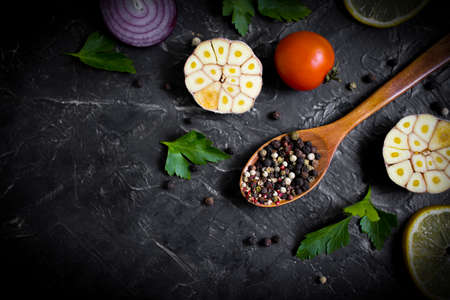 Fresh vegetables, tomatoes and mushrooms with different spices on a black background