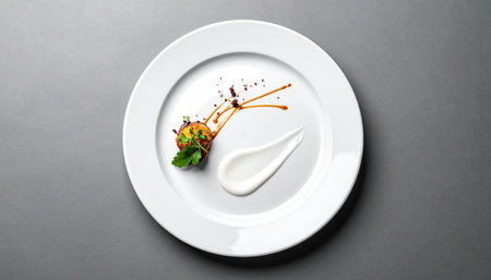 A minimalist setup of a modern culinary dish, focusing on the intricate plating and color contrasts.