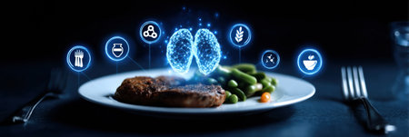 A gourmet steak with green vegetables is showcased on a dark table, accented by floating culinary icons.