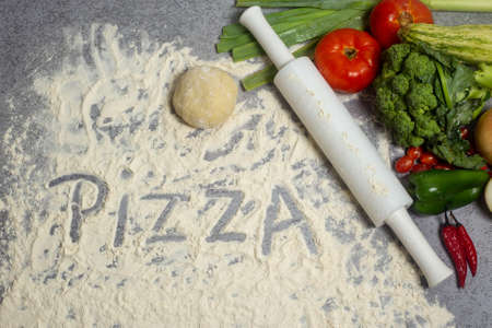 The raw pizza ingredients on the gray background written pizza with wheat flour