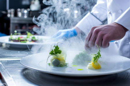 A skilled chef artfully garnishes a gourmet dish in a contemporary kitchen. The image captures the essence of culinary creativity and precision in food presentation.