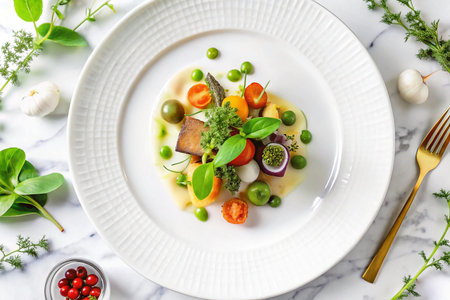 Gourmet dish, plated, marble tabletop, fresh herbs