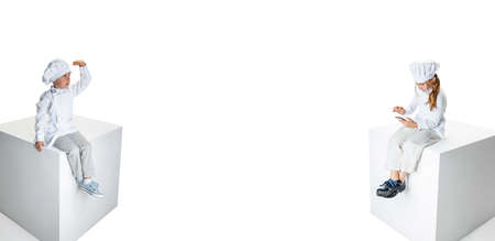 Collage. Set of children, little boy and girl in image of restaurant chef, wearing special uniforms isolated over white background
