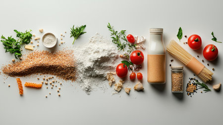 A vibrant assortment of fresh ingredients, including tomatoes, flour, and herbs, arranged artfully on a light surface, ideal for cooking or recipe inspiration.