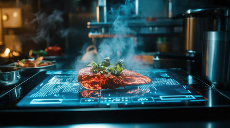 A piece of meat is cooking on a digital screen, with steam rising from it. Concept of futuristic technology and innovation in the culinary world