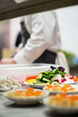 Professional chef cooking in the kitchen restaurant at the hotel, preparing dinner. A cook in an apron makes a salad of vegetables and pizza.