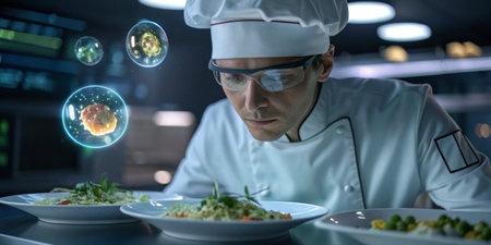 A chef skillfully prepares a gourmet dish, enhancing its elegance with digital effects. The interplay of technology and culinary art creates a mesmerizing dining experience.