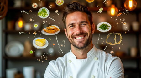 A chef stands in a lively restaurant, smiling as he imagines various delicious dishes, surrounded by vibrant food illustrations that float around him.