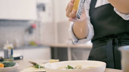 The girl is rubbing Dutch cheese on a grater for ravioli