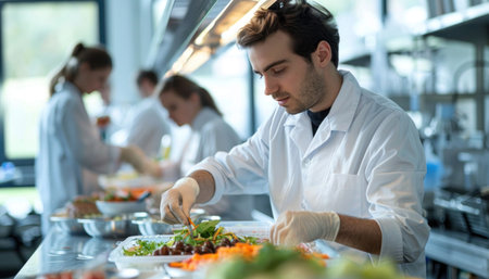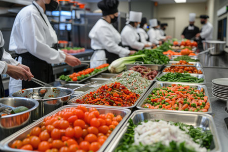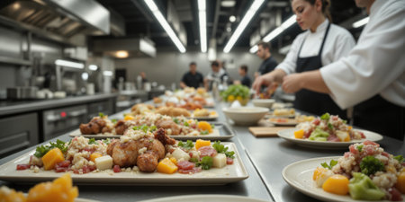 In a lively culinary workshop, chefs focus intently on preparations, chopping vegetables and mixing fresh ingredients. Their teamwork culminates in vibrant dishes filled with color and flavor.