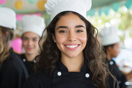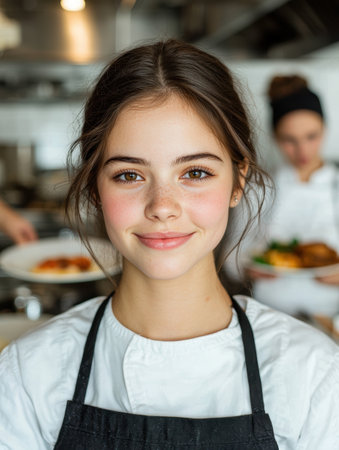 Young Female Chef Smiling at Culinary Event in Professional Kitchen.