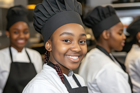 Smiling African American Female Chefs in Professional Kitchen Attire.