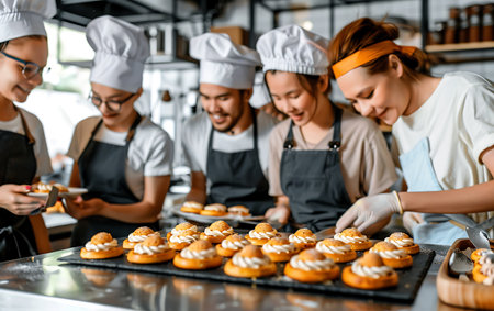A cheerful chef demonstrates baking techniques while students listen attentively in a busy kitchen. Fresh pastries and cupcakes are arranged on the table, creating a warm atmosphere.