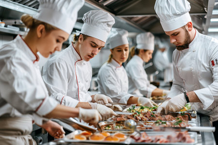 Culinary Excellence in Action: Chefs Preparing Gourmet Dishes in a Commercial Kitchen