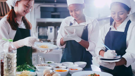 Asian senior chef in uniform educates multiracial students in a restaurant kitchen. Focus on teamwork learning and note-taking in this professional teaching environment. Food Edocation