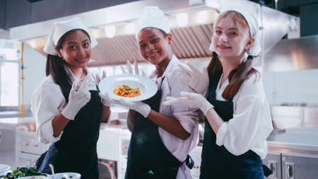 Portrait young teen girl cook student. Cooking class. Culinary classroom. Happy young woman students for cooking in cooking school.