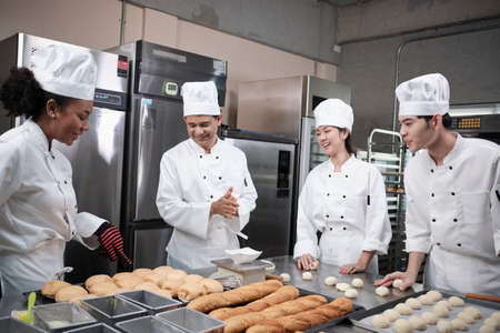 Multiracial professional gourmet team, four chefs in white cook uniforms and aprons knead pastry dough and flour, prepare bread, and bakery food, baking in oven at stainless steel restaurant kitchen.