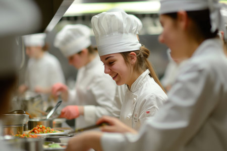 Young culinary students collaborate and focus on preparing dishes in a busy kitchen environment.