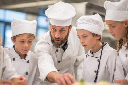 A professional chef teaches a group of children cooking techniques in a bright, modern kitchen. The kids are focused and eager to learn new culinary skills.