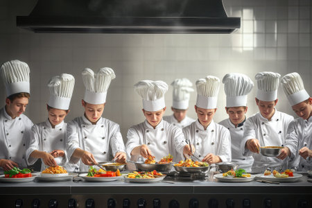 Children in professional kitchens, dressed as chefs, learning culinary arts.