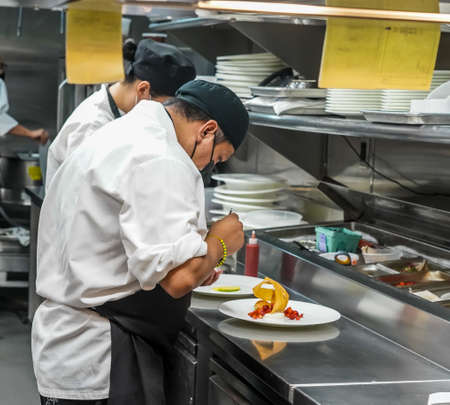 NEW YORK - AUGUST 26, 2021: In the kitchen of Gabriel Kreuther restaurant in Midtown Manhattan. It is Two Star Michelin and Relais & Chateaux award-winning restaurant
