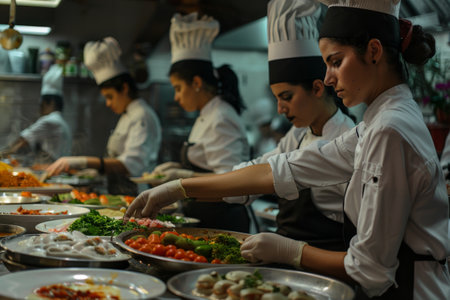 Men and women preparing fresh gourmet meals in commercial kitchens generated by artificial intelligence