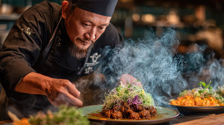A skilled chef showcases his culinary talent by meticulously plating a gourmet dish. Steam rises from fresh ingredients as he adds delicate garnishes.