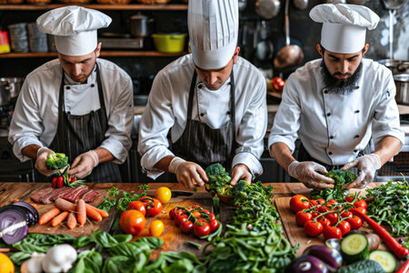 group of chefs cutting vegetables in the kitchen of a restaurant or hotel