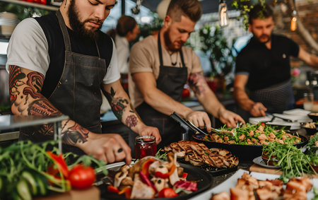 A skilled chef meticulously plates gourmet dishes in a modern kitchen, showcasing fresh ingredients and artistic techniques for an elevated dining experience.