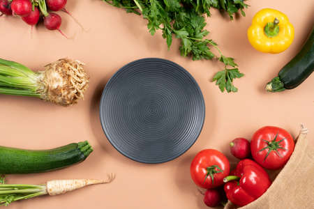 Top view flat lay Organic vegetables composition. Vegetables variety on color paper background with copy space. Healthy food concept. Vegan and vegetarian eating. Foods high in vitamin, antioxidant, mineral and fiber