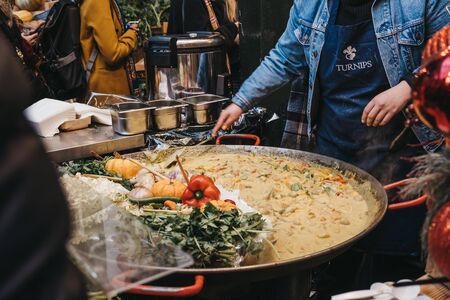 London, UK - November 29, 2019: Woman serving vegetable curry at the Turnips stand in Borough Market, one of the largest and oldest food markets in London, selective focus, motion blur.