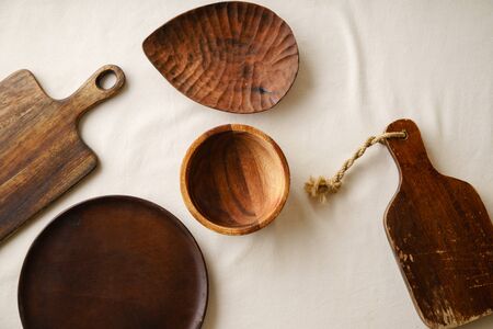 Various wooden tableware. Cutting boards, plate and bowl on linen tablecloth