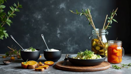 Rustic wooden table with black bowls of porridge, sliced oranges, and jars of pickled vegetables.