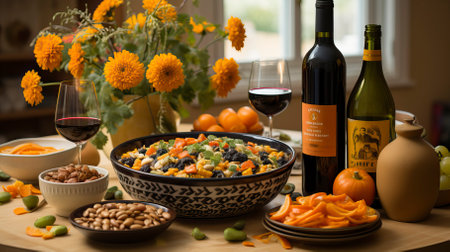 Experience a vibrant table setting filled with fresh ingredients, colorful dishes, and rustic charm, perfect for gatherings or special occasions.