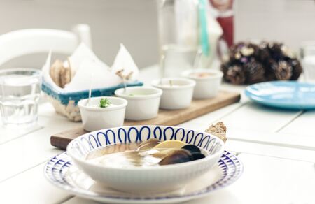 Seafood soup with mussels, prawns and fish in white bowl with blue ornament with sauce in small bowls for traditional meze dinner on the wooden table on background