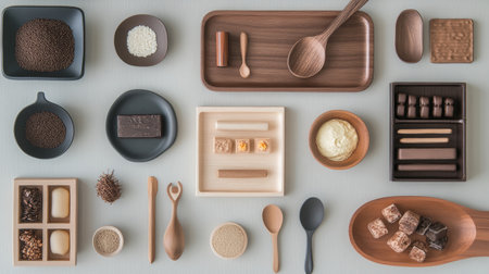 An artistic flat lay of various cooking utensils and ingredients, arranged neatly on a light surface with a minimalist touch.