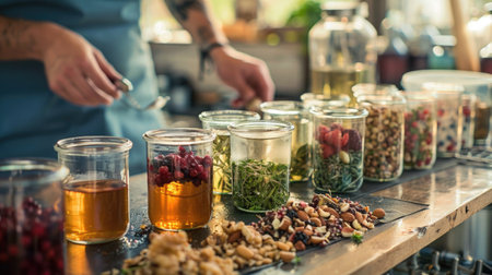 A hands-on workshop setting, where participants are learning to make their own cortisol-reducing drinks, featuring a variety of ingredients like wild berries, nuts, and green tea extracts.