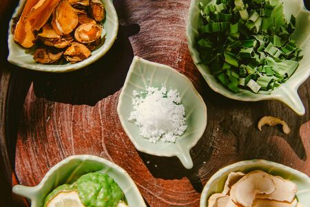 set of herbal spa treatments skin care salt bergamot sliced pandan leaf turmeric and curcumin