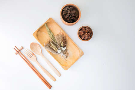 Bangkok, Thailand April 21,2020 white utensil holder ceramic decorated with wood cutting board and small wood spoon and fork in white background on the table
