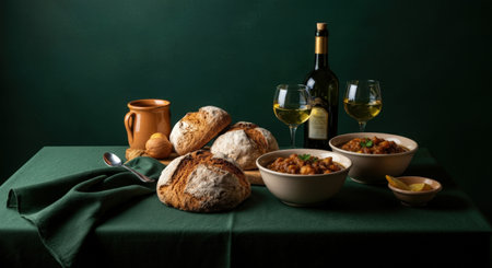 A beautifully arranged rustic table featuring freshly baked bread, hearty stew, and elegant glasses of white wine. The warm colors and textures create an inviting atmosphere perfect for a cozy meal