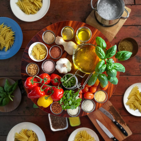 An artistic aerial view of fresh vegetables, colorful pasta, and vibrant herbs arranged beautifully, showcasing the essence of healthy cooking and fresh ingredients.