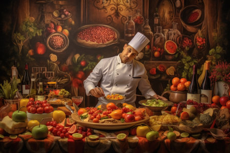 A bustling restaurant kitchen showcases vibrant dishes of pasta, fresh vegetables, and a warm dining atmosphere, capturing the art of culinary creation.