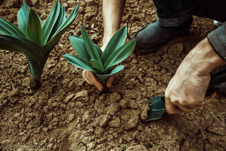 man tenderly plants a young green plant in rich soil, carefully ensuring its roots are secure and ready to grow.