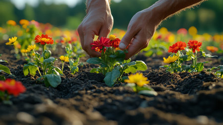 Soft sunlight illuminates a garden where hands are carefully nurturing colorful flowers, creating a peaceful atmosphere at dusk.