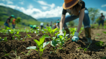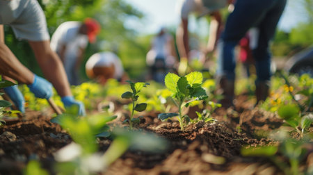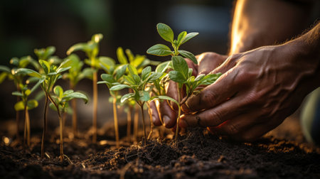 Diverse hands planting seedlings in fertile soil, natural lighting and a peaceful, hopeful mood filled with sunshine