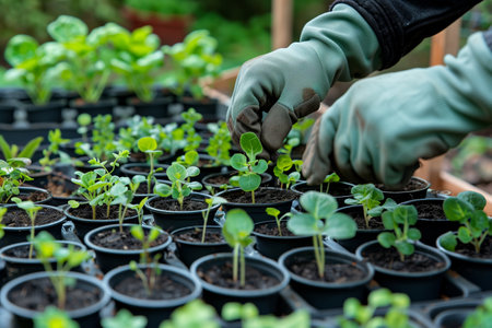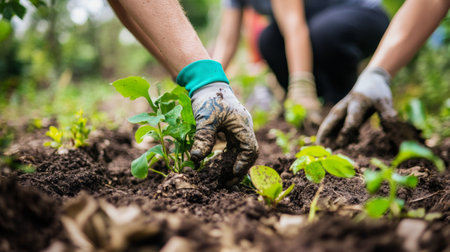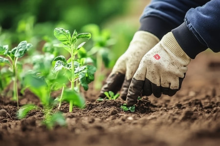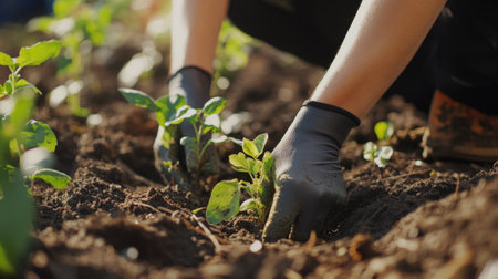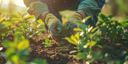 Close-up of hands wearing gloves planting seedlings in a garden. The background is blurred, focusing on the plants and hands. Concept of gardening and nature.