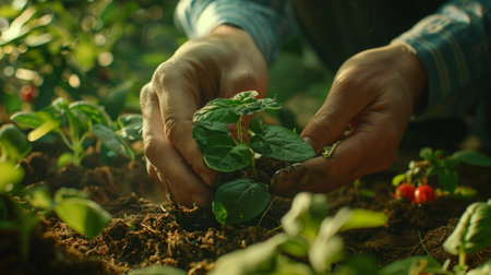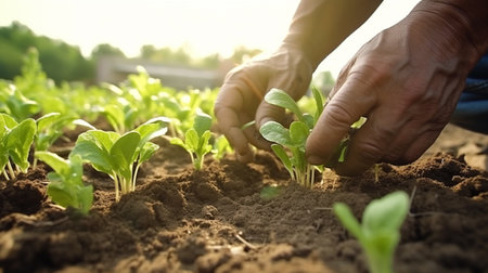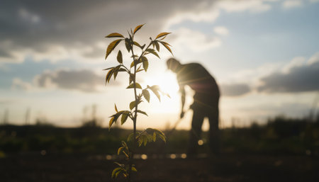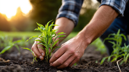 Hands gently planting a seedling into rich soil on an organic farm, symbolizing sustainable agriculture and growth. the warm sunset creates a serene backdrop, the importance of nurturing and environmental conservation. Generative AI
